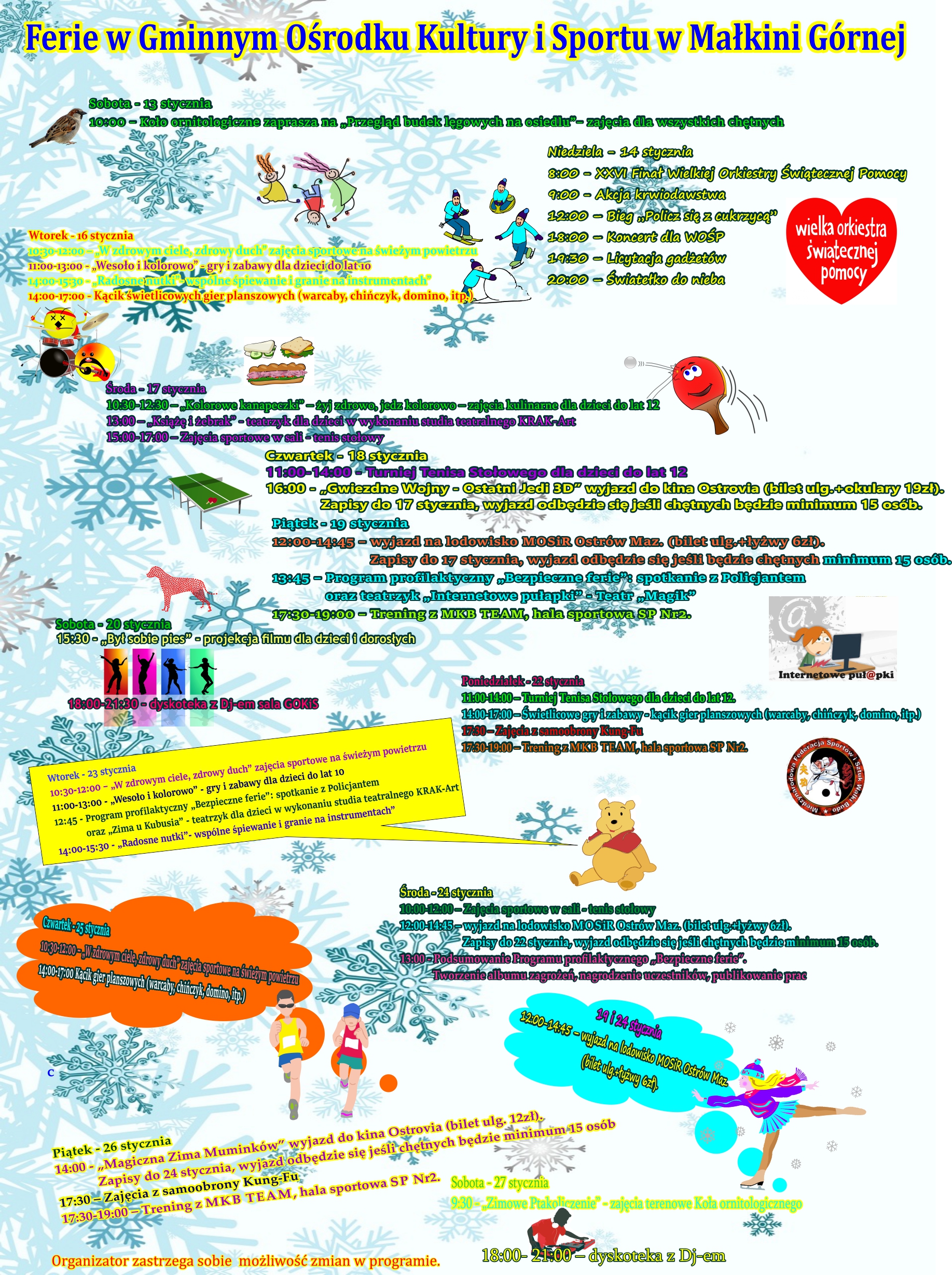 W dniu 14 kwietnia w Gminnym Ośrodku Kultury i Sportu w Małkini Górnej odbył sie koncert Big Band - DLA FRAJDY. Zespół powstał w lutym 2013. Choć na razie to raczej „small band” lub raczej „big banda”, ma ambicje być kiedyś big bandem w pełnym składzie. Zespół skupia wokół siebie muzyków zawodowych i grających na wysokim poziomie pasjonatów muzyki. Niewątpliwą atrakcję i mocny atut zespołu stanowi sekcja instrumentów dętych: saksofony, trąbka, klarnet. Mocnym fundamentem i ozdobą grupy jest sekcja rytmiczna z wsparciem solowym: perkusja, instrumenty perkusyjne, bas, gitara, instrumenty klawiszowe. Podczas koncertu usłyszeć można było hity w rytmach swinga, samby czy bossa nowy z repertuaru takich gwiazd jak Frank Sinatra, Louis Armstrong czy Orkiestra Duke’a Ellingtona. Zwolenników mocniejszych brzmień zadowolić mogły zaś utwory grane w rytmie bluesa, rocka czy funk z repertuaru takich gigantów rozrywki jak The Beatles, Jaco Pastorius, Michael Bublé.